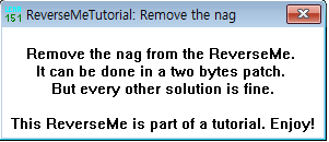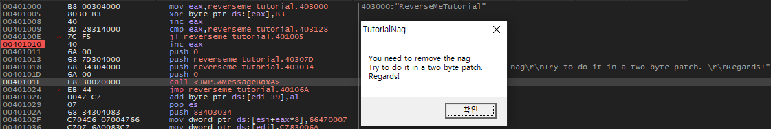 4012BD 주소에서 MessageBoxA 함수를 호출하는데 인자로 2byte를 패치해서 Nag를 없애라는 문자열이 있다.