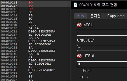401016 주소를 선택한 다음 Ctrl + 9 키를 눌러 위와 같이 NOP으로 채우고