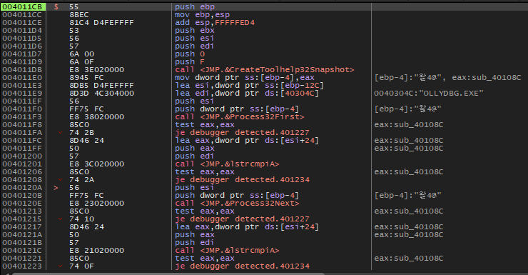 즉, 위의 루프에서는 스냅샷 된 프로세스 목록에서 OLLYDBG.EXE 문자열과 일치한 프로세스가 나올 때까지 프로세스 정보를 가져와 비교한다.