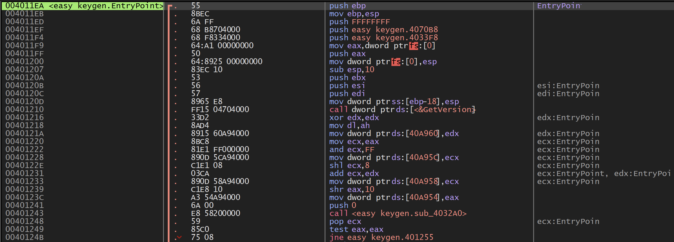 이렇게 위의 401077 주소부터 4010B4 주소까지가 사용자가 입력한 Name 값을 가지고 암호화 하는 부분이고, ebp의 값이 ecx보다 작을 때까지 총 3번 반복을 도는데, 40107E 주소에서 esp+esi+C의 값은 1번 째 루프에서는 10, 2번 째 루프에서는 20, 3번째 루프에서는 30이 되며, 401083 주소에서 esp+ebp+10의 값은 사용자가 입력한 값이다.