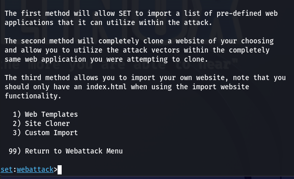 1번은 setoolkit에 기본적으로 내장되어 있는 웹사이트를 이용하는 것이다.