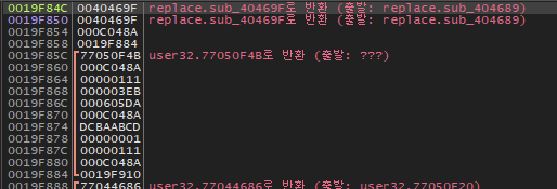 , 40469F 주소를 스택에 넣은 후 404689 주소에 있는 함수를 호출하므로 4048D0 주소의 값은 60163605가 되고