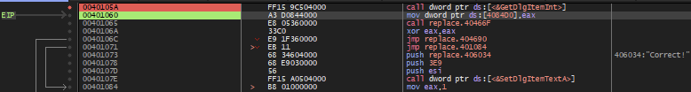 그러면 위와 같이 401073 주소에서 "Correct!" 문자열을 스택에 넣고 이어서 40107E 주소의 GetDlgItemTextA() API 함수를 통해 출력하는 것 같은데, 문제는 401073 주소로 조건 분기하는 부분이 없다는 것이다.