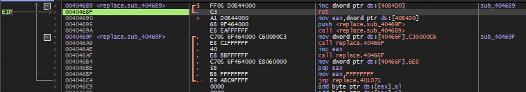 404689 주소에 있는 함수는 위에서도 언급했듯이 4084D0 주소에 있는 값을 증가시키는데, 이번에는 스택에 40469F 주소를 넣었기 때문에 한 번 증가시키고는 ret 명령에 의해 40469F 주소로 이동한다.