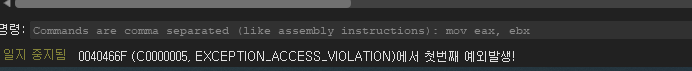 40466F 주소에서 F8 키를 눌러 실행하면 위와 같이 예외가 발생한다.
