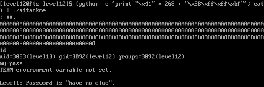// (perl -e 'print "NOPs....Shellcode...[SFP][RET]"'; cat) | /home/level12/attackme 명령어