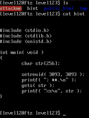 취약점이 있는 attackme라는 파일이 있고, hint 파일, level12의 웹 페이지가 있는 public_html 디렉토리와 공격을 위한 테스트 공간인 tmp 디렉토리가 있다.