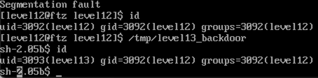 실제 서버라면 취약점이 패치될 수도 있고, 재부팅 등으로 서버의 환경이 바뀐 경우에 바이너리를 다시 분석해서 덮어써야 할 정확한 주소를 파악하는 등의 번거로움이 발생하므로 간단하게 level13 권한을 얻을 수 있는 백도어를 심어두는 것이 좋다.