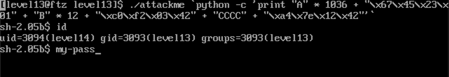 이전에 분석했던 메모리 구조를 기반으로 공격 스크립트를 위와 같이 작성하고 공격하면 위와 같이 level14의 셸을 딸 수 있다.