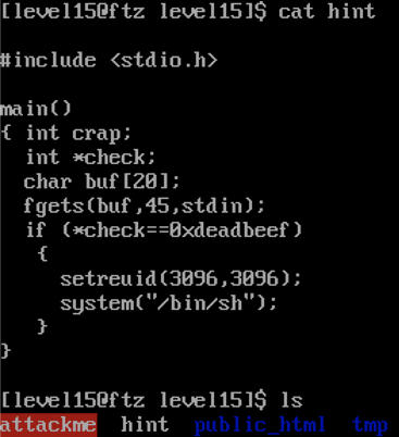 문제 파일 attackme의 소스코드가 담긴 hint 파일을 보니 level14 문제와 거의 다를 게 없다.