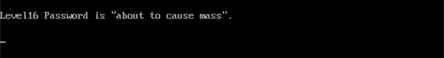 위와 같이 bash shellscript를 이용해 공격할 수 있고, level16의 password는 about to cause mass이다.