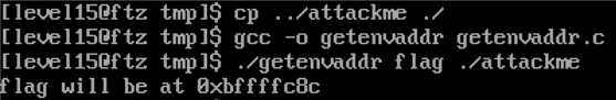 level15의 attackme 파일을 tmp 디렉토리로 복사해주고, getenvaddr.c 코드를 컴파일하여 위와 같이 flag 환경 변수의 주소를 알아온다.