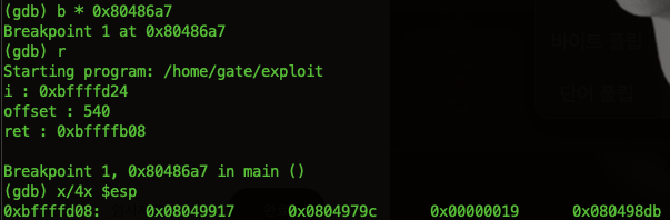 다만 원래는 0xbffffb08값이 45번 입력되어야 하지만 1byte 침범으로 인해 180byte 중 176byte만 정확히 0xbffffb08값이 써지고 나머지 4byte 중 1byte가 침범되어 3byte가 남게 된 것이다.