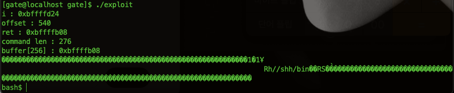 위의 사진을 참고하면 셸이 안 떨어지는 것을 보니 &i - 524의 주소가 buffer[256]의 시작 주소이지만, &i - 525의 주소도 셸이 떨어진다.