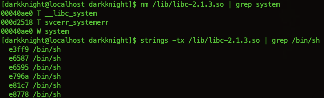 strings -tx /lib/libc-2.1.3.so | grep /bin/sh