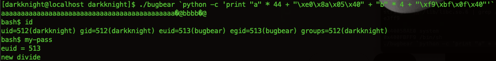 위에서 알아낸 정보들을 바탕으로 payload를 구성해 bugbear에 인자로 주어 실행하면 bugbear의 password인 new divide를 얻을 수 있다.