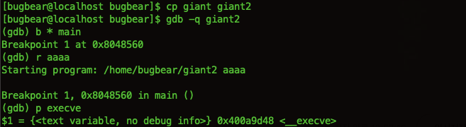 위와 같이 ldd와 nm 명령으로 execve() 함수의 주소를 알아내도 되지만 gdb를 이용해서 주소를 알아낼 수 있다.