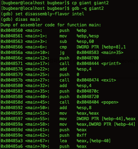 fp = popen("/usr/bin/ldd /home/giant/assassin | /bin/grep libc | /bin/awk '{print $4}'", "r");