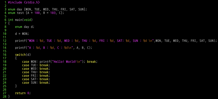 16행부터 25행까지의 경우는 열거형 자료형을 어떻게 사용할 수 있는지 보여주고 있다.