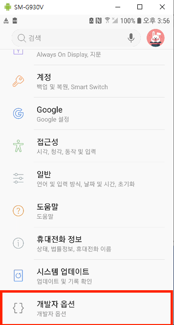 만약 자신의 스마트폰에서 개발자 옵션 항목이 없다면 sean.tistory.com/23?category=874763의 글을 따라 하여 개발자 옵션 항목을 활성화해줍니다.