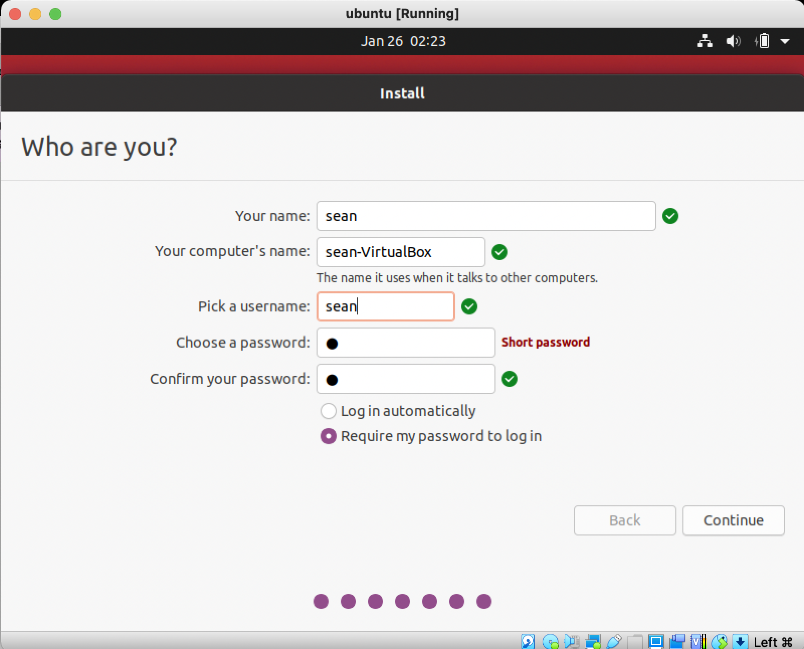 아래의 사진을 참고하여 자신의 계정과 비밀번호 그리고 운영 체제의 이름을 설정한 뒤 continue를 눌러 진행해줍니다.