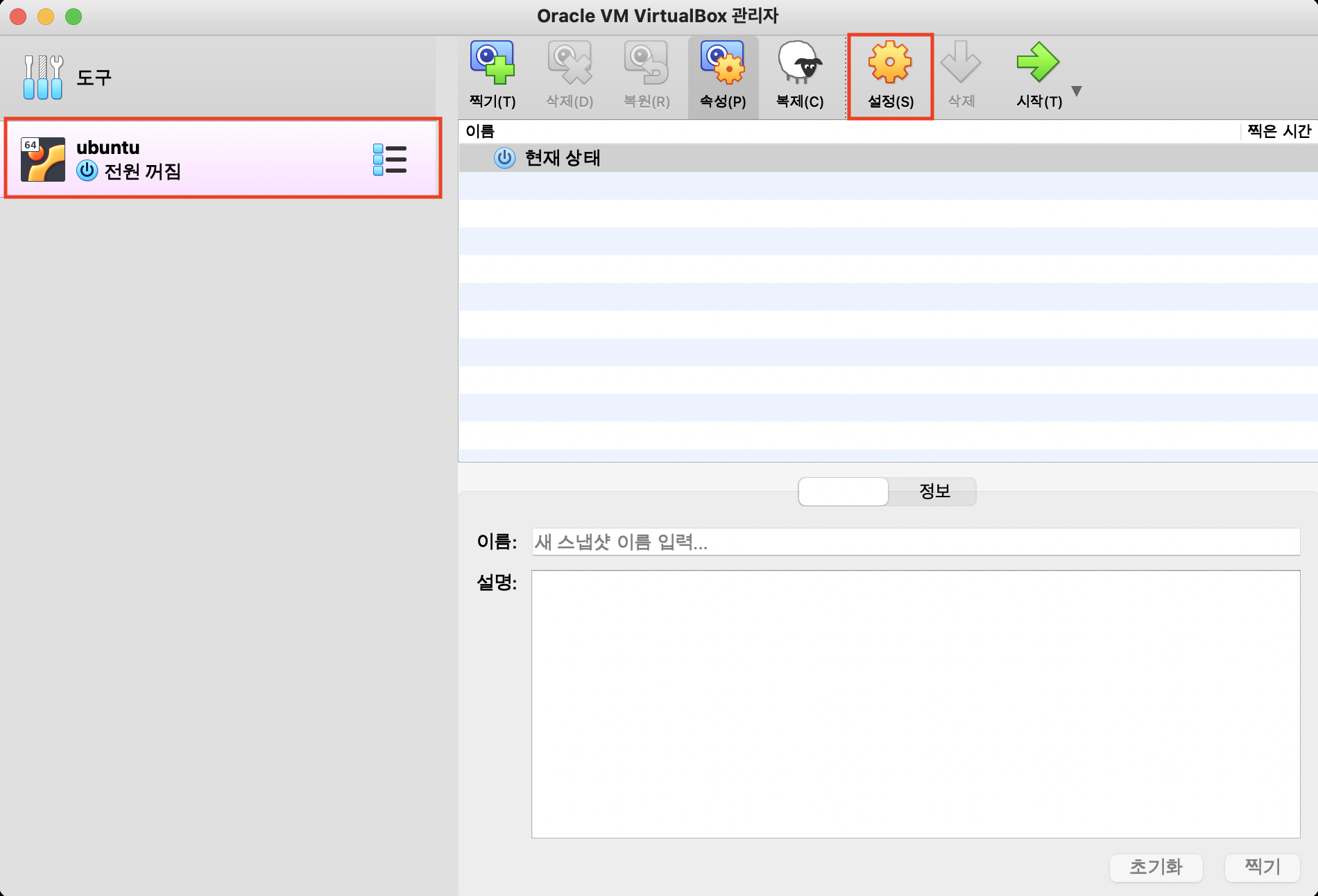 그리고 설정을 눌러 해당 가상 머신의 설정창에 들어가 줍니다.
