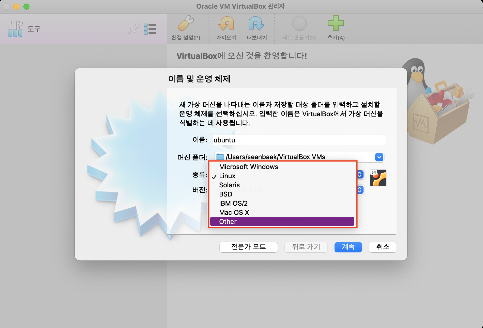 보통은 vbox에서 사용할 경우 아래의 사진과 같이 첫 번째를 선택해주면 됩니다.