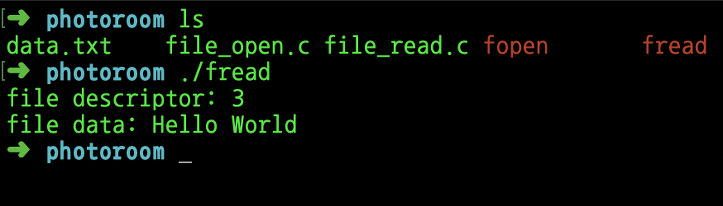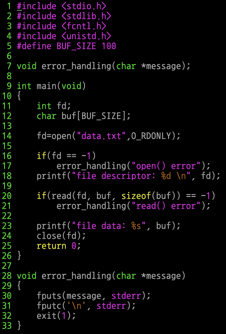 20번째 줄 : read 함수를 사용해서 12행에 선언된 배열 buf에다가 data.txt 파일의 내용을 읽어와서 저장하고 있다.