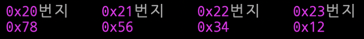 최상위 바이트 0x12가 작은 번지수 0x20번지로 저장된다.