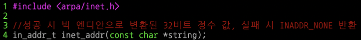 위 사진의 예제는 inet_addr 함수의 활용한 예시이다.