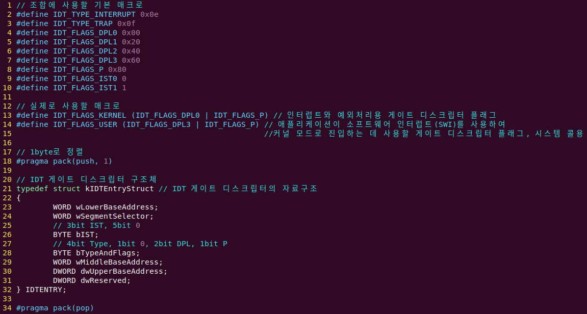 아래는 IDT 게이트 디스크립터의 자료구조와 매크로 입니다.