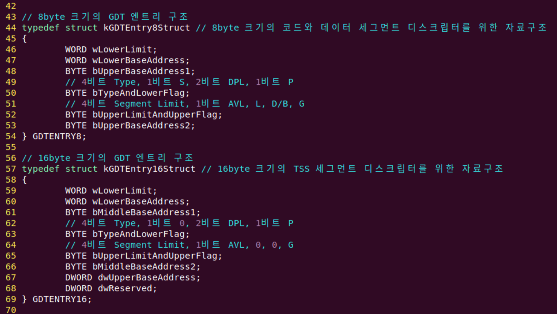 GDT는 GDT 테이블과 GDT에 대한 정보를 나타내는 자료구조로 구성되어 있기 때문에 이 두 가지 자료구조를 정의하고 각 자료구조에 맞는 매크로도 함께 정의합니다.