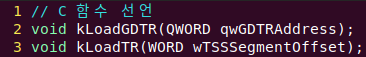 LGDT, LTR 명령어는 모두 어셈블리어 명령이므로, 이를 수행하는 어셈블리어 함수를 만들어 C 코드에서 호출합니다.