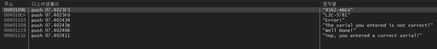 serial key를 입력하는 문제들은 입력한 serial 값이 일치한지 일치하지 않은지에 대한 문구를 띄우는 부분 이전에 프로그램 내에 있는 정해진 serial 값과 사용자가 입력한 serial 값을 비교하는 부분이 있다.