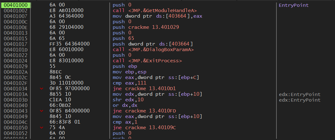 40101D 주소에서 DialogBoxParamA 함수를 호출하면 Serial 값 입력창이 뜬다.