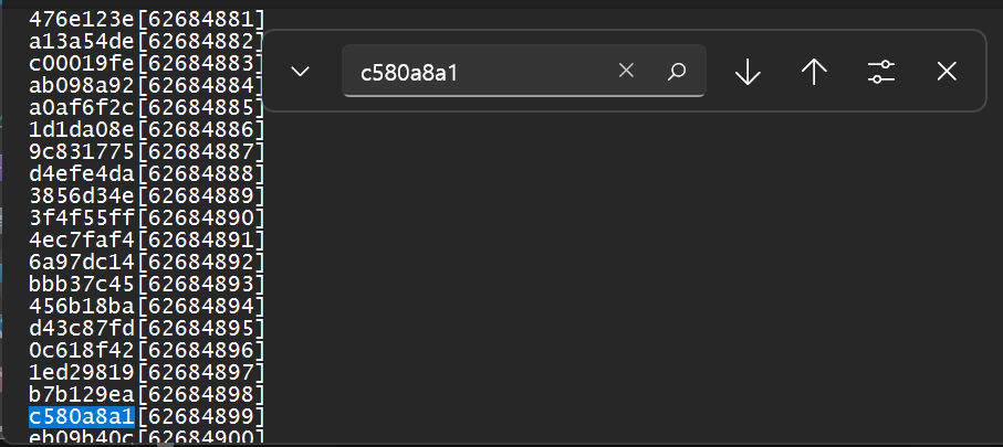 위의 코드를 실행하면 9개의 txt 파일이 생기는데 각 파일에서 해시 값의 앞 8자리 c580a8a1를 검색한다.