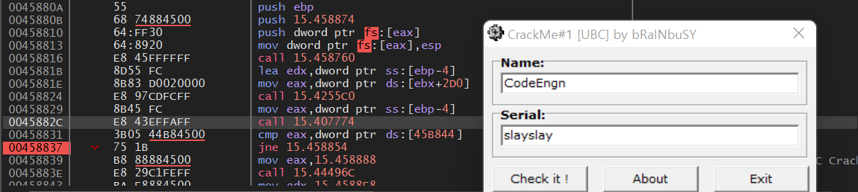 Ctrl + F2로 재실행 후 458837 주소의 BP를 삭제하고, 45882C 주소에 BP를 걸고 실행한 후 CodeEngn / slayslay 를 입력하고 Check it!를 누른다.