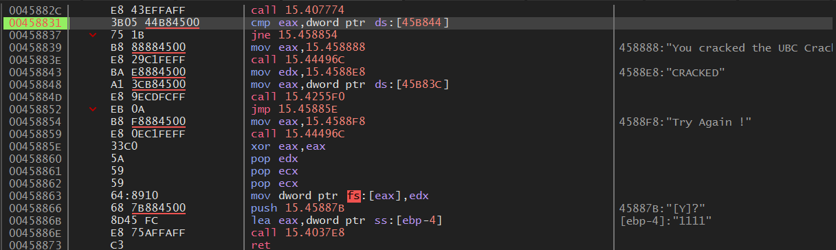 "CRACKED" 문자열 출력 이전에 "You cracked the UBC CrackMe#1 ! Please send your solution to ubcrackers@hotmail.com !" 문자열을 출력하는데, 이 부분은 Serial 값과 일치하는 값을 입력했을 때 출력되는 부분으로 458837 주소의 jne 명령어에 의해 조건 분기한다.
