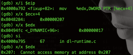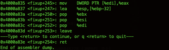 - _dl_lookup_versioned_symbol() 함수를 끝내고 fixup 함수로 복귀하여 _dl_lookup_versioned_symbol() 함수에서 알아낸 SYMTAB 주소 edx 레지스터에 저장