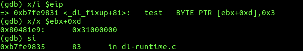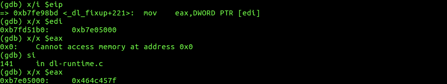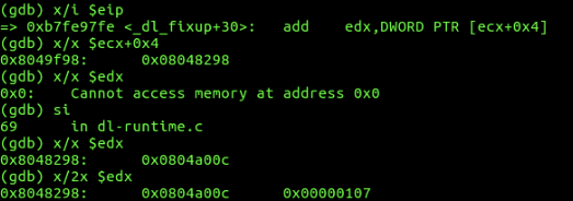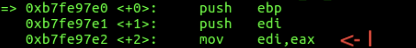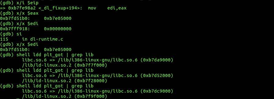 _dl_lookup_symbol_x 함수의 반환값을 edi 레지스터로 옮기는데 반환값은 lib의 주소(0xb7e05000)가 들어있는 주소 0xb7fd51b0이다.
