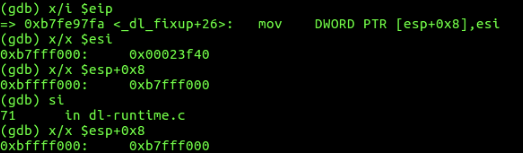 link_map의 주소로부터 0x1cc offset만큼 떨어진 곳에 있는 값 0xb7fffad0을 스택에 넣는다.