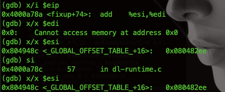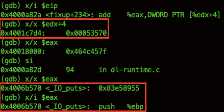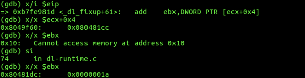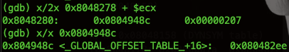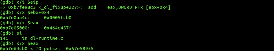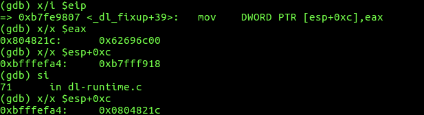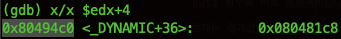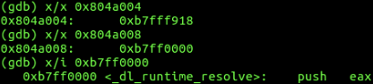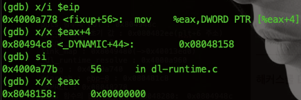 link_map의 주소(0xb7fff918)에 있는 값 0x0을 eax 레지스터에 들어있는 값(0x804a00c)에 더해 eax 레지스터에 넣는다.