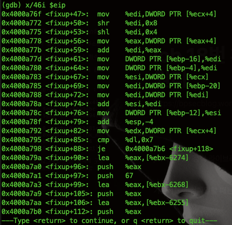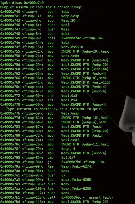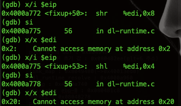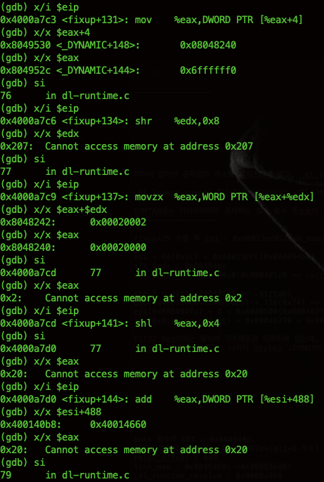 - GOT 주소 알아와서 EBP-12 주소에 기록하고 재배치 타입을 비교해 조건 분기 및 esi 레지스터에 link_map 주소 넣기