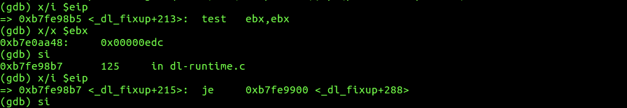 dynamic 링킹 시작(push link_map(0xb7fff918), jmp _dl_runtime_resolve(0xb7ff0000))