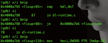 edx 레지스터에는 .dynsym 테이블에서의 index와 재배치 타입값이 들어있는데, 이 값에서 재배치 타입 값이 0x7인지 확인한다.